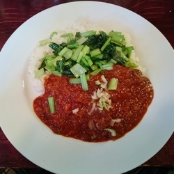 表題の「牛すじカレーごはん+青菜炒め」である!